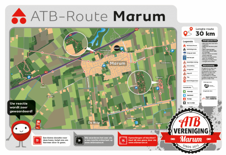 Recentelijk is er door de mountainbike-vereniging Marum een prachtige route van 30 km aangelegd. Fiets naar camping de Watermolen aan de Openderweg 26 in Opende (1 km vanaf de groepsaccomodatie) en volg daar de zwarte bordjes. Deze loodsen je naar de echte mountainbike-route die aangegeven is met rode bordjes. Blijf deze bordjes volgen.